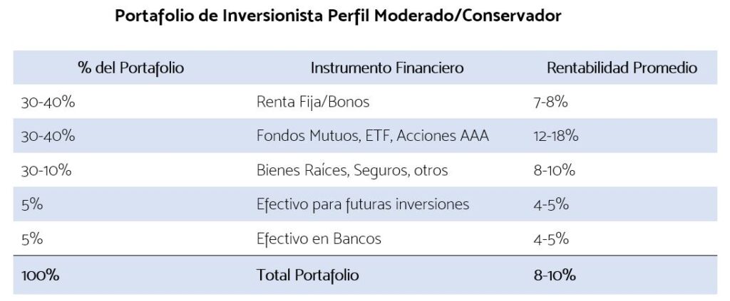 Por ejemplo, los inversionistas exitosos con un perfil moderado/conservador construyen portafolios de inversión diversificados de la siguiente manera: