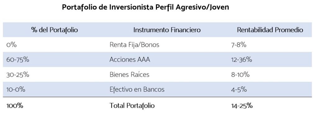 En contraste a continuación podemos apreciar como una persona con mayores expectativas de ganancia, tolerancia al riesgo y mayor tiempo para trabajar e invertir puede lograr mayores niveles de rentabilidad, siempre y cuando tenga a su disposición las herramientas correctas para lograr sus objetivos.