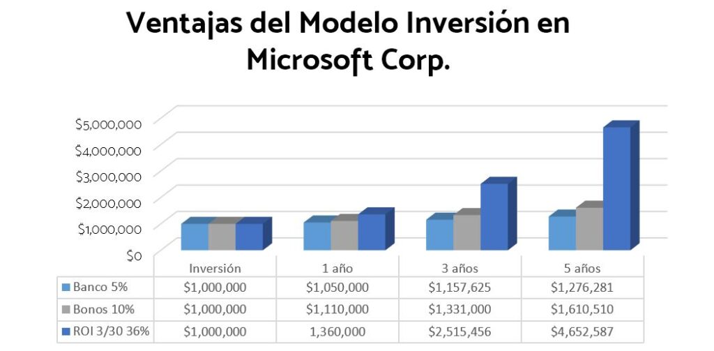 Y el modelo de inversión basado en acciones de Microsoft Corporation que lograron rendir 36% de ROI. Claramente la ventaja de un modelo sobre otro es visible. Es de suma importancia destacar que los riesgos que los inversionistas toman al invertir en acciones de Microsoft Corporation son menores que la mayoría de instrumentos ya que estos gozan de una calificación de riego “AAA” lo cual significa, el más alto nivel de seguridad, estabilidad y rentabilidad para los inversionistas de acuerdo a S&P Global Ratings.