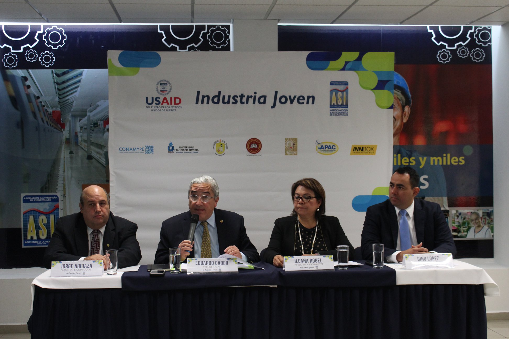 El evento fue presidido por presidente de la ASI, Eduardo Cader; Jorge Arriaza, Director Ejecutivo ASI; Gino López, COP del Industria Joven; Ileana Rogel, presidenta CONAMYPE; Ramón Vega, Director Ejecutivo AGAPE; Evelyn Guerra, Gerente General APAC; José Humberto Flores, Vice Rector UDB; Ricardo Morales, Decano UNICAES; Mario Ruíz, Rector de UFG; Juan Carlos Reyes, gerente financiero de INNBOX.