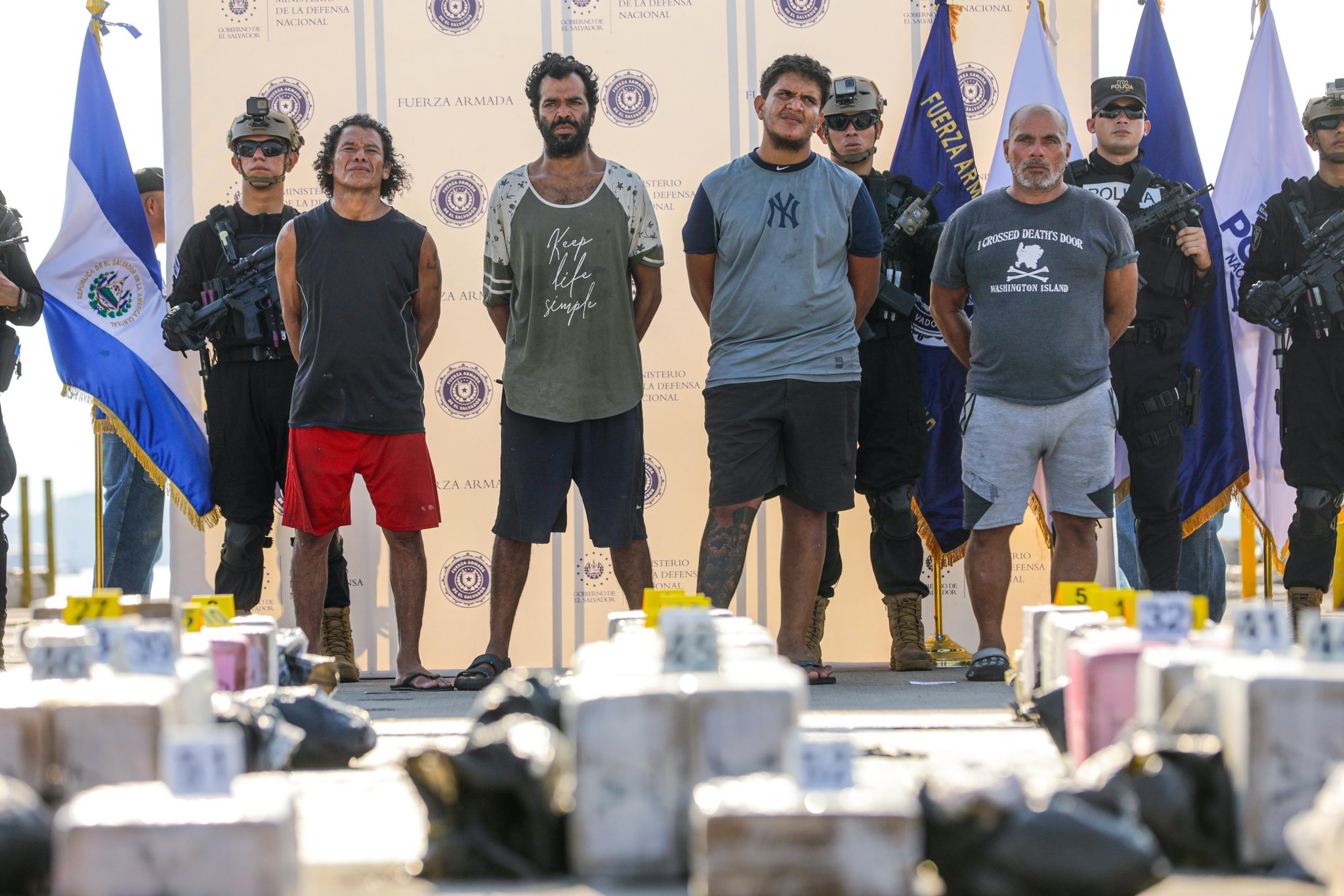 Las autoridades de seguridad de El Salvador presentaron este miércoles la tonelada de droga decomisada en una narcolancha de bandera costarricense y a los 4 tripulantes de esta, todos ciudadanos de Costa Rica.