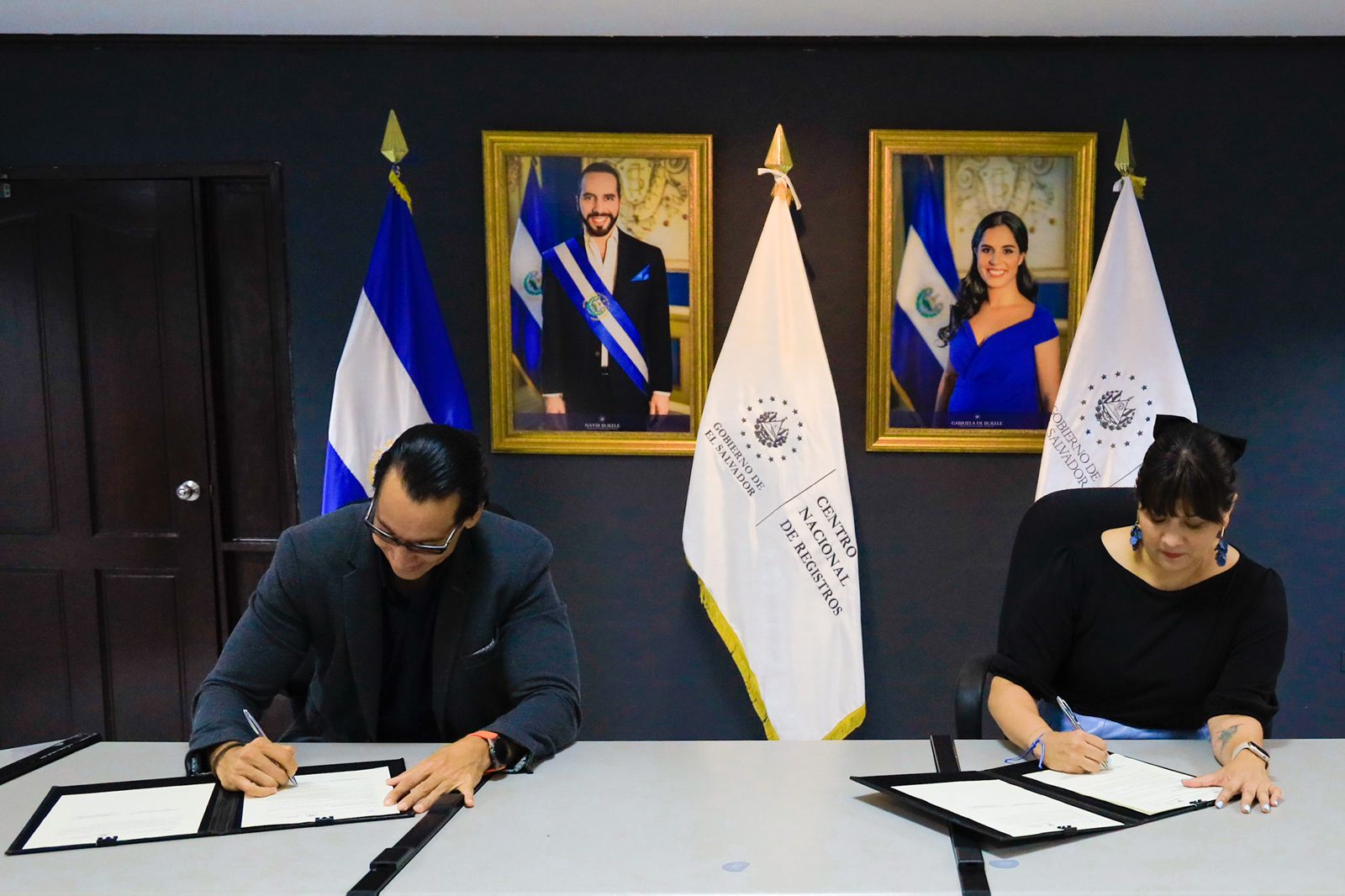 La ministra de Cultura, Mariemm Pleitez, y el director ejecutivo del Centro Nacional de Registro (CNR), Jorge Camilo Trigueros, firmaron un convenio de cooperación a fin de simplificar el proceso de inscripción de artistas al Registro Nacional de la Cultura y el Arte (RENTCA).