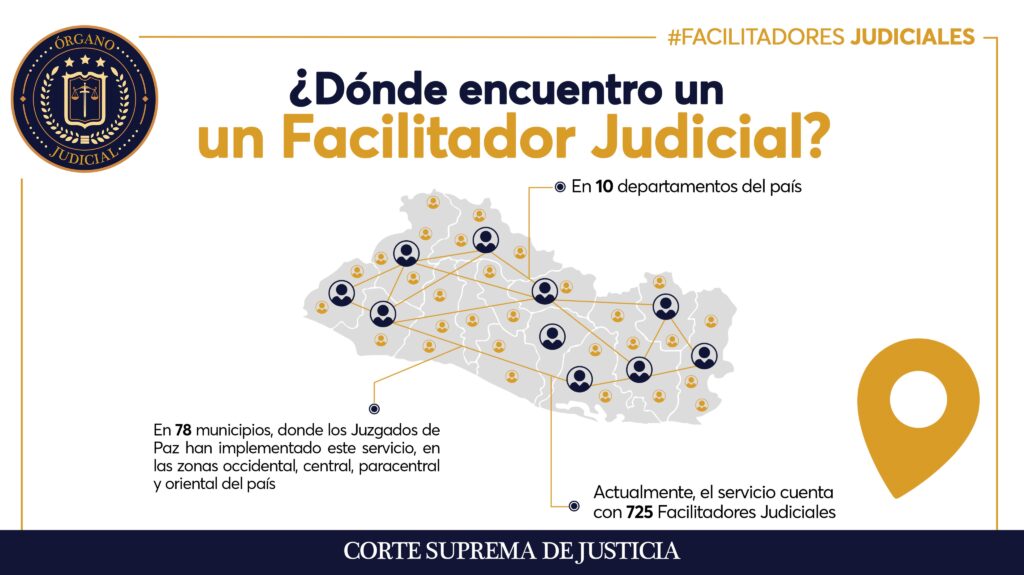 Actualmente, este programa cuenta con 725 facilitadores judiciales distribuidos en 78 municipios de 10 departamentos, abarcando las zonas occidental, central, paracentral y oriental.
