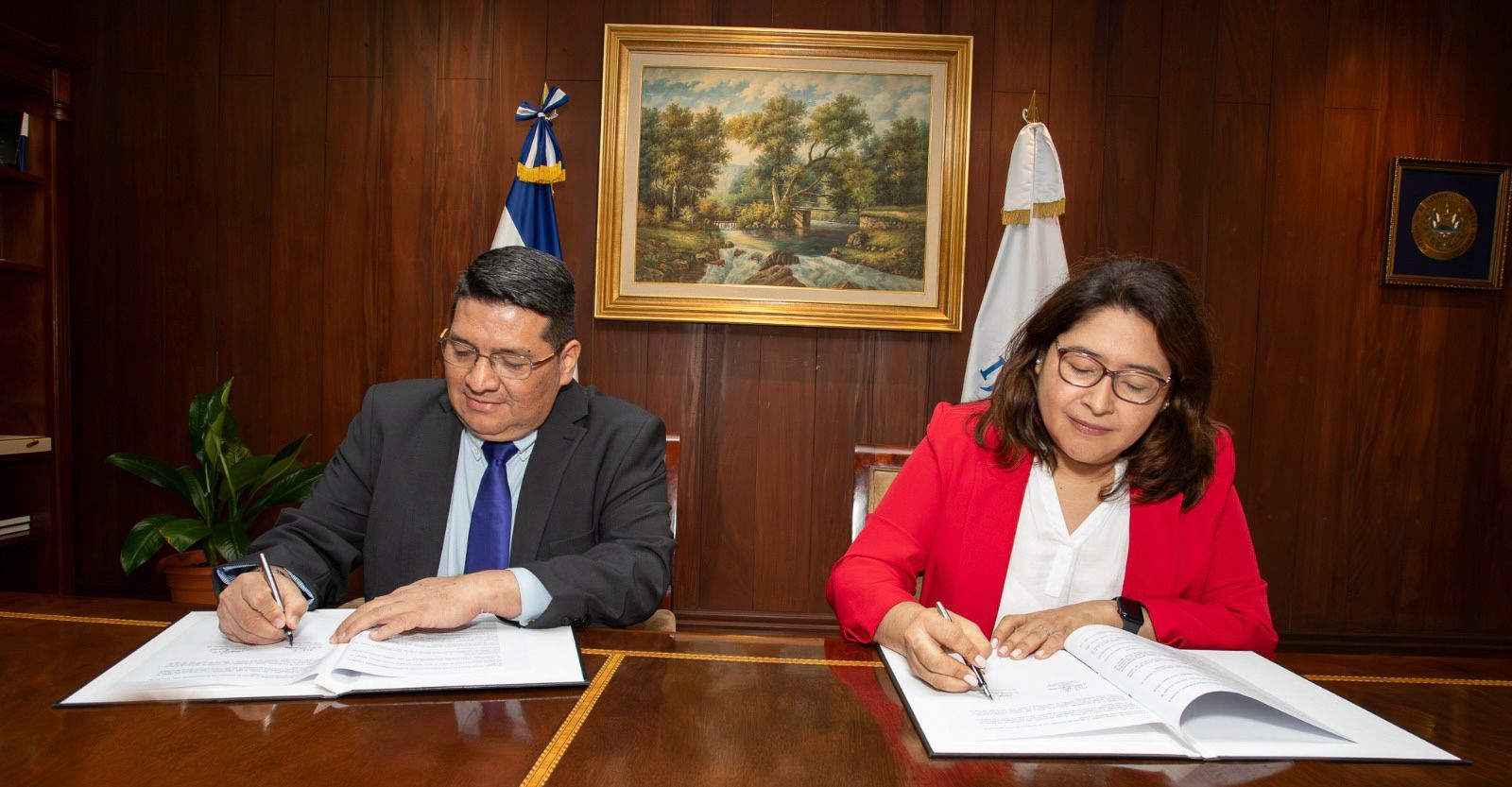 En la firma del convenio, estuvieron presentes también el presidente de la Sala de lo Penal, Alejandro Antonio Quinteros, y la directora de Atención Integral a las Mujeres y Acceso a la Justicia, Vanessa Margarita Leiva.