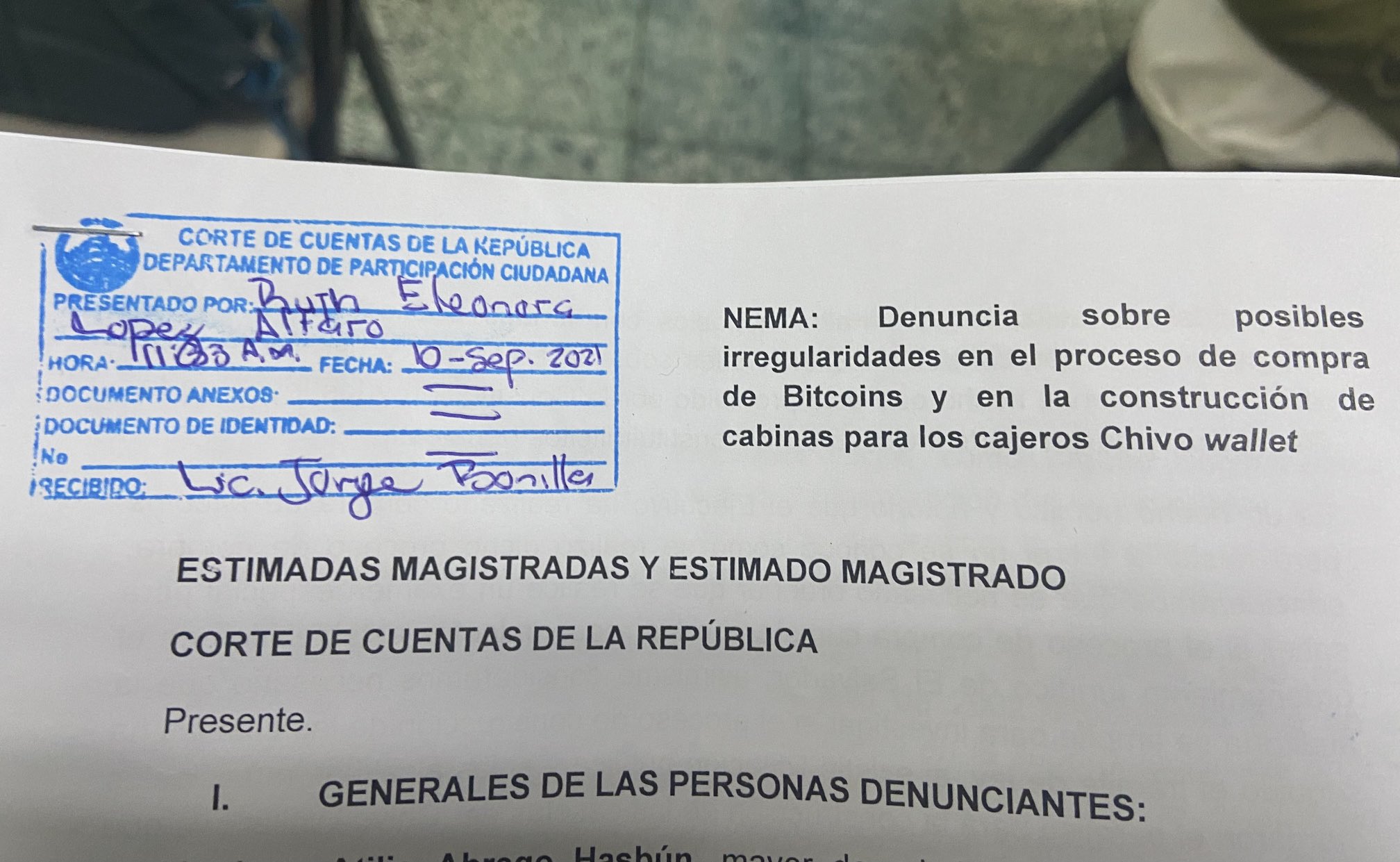 Este día, Cristosal entregó una denuncia a la Corte de Cuentas de la República para que se realice examen especial sobre los procesos relacionados a la implementación de la ley Bitcoin