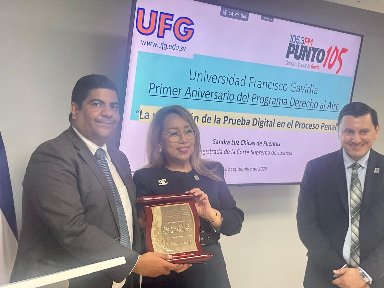 El evento concluyó con la entrega de un reconocimiento a la magistrada de la Sala de lo Penal por su trayectoria académica y profesional, reafirmando el compromiso de la UFG con la excelencia académica y la justicia social.