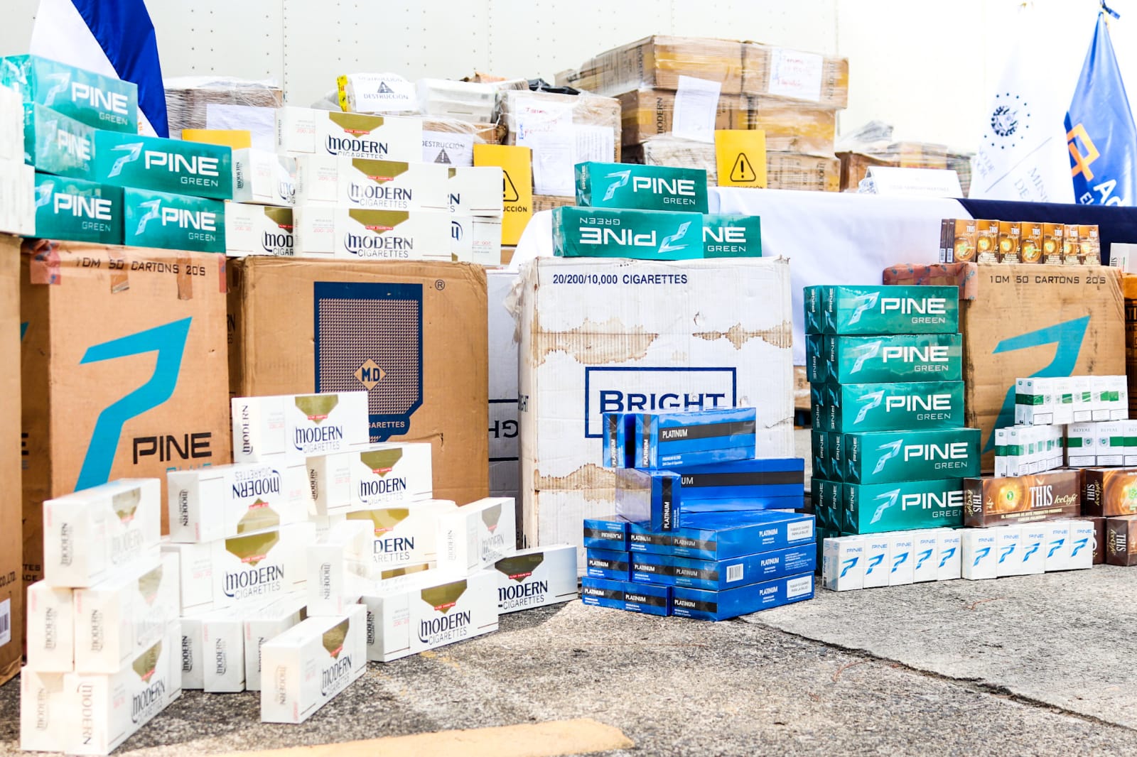 Se han identificado más de 45 marcas de cigarrillos, con un peso aproximado de 6,161.75 kilogramos, de estas las de mayor indice de contrabando son: modern, gold city, brass, genial, marvel, royal, pine green, entre otros, decomisados en diferentes puntos fronterizos y varios establecimientos del país. El producto contrabandeado será trasladado a Metapán, Santa Ana, donde será procesado para su destrucción.
