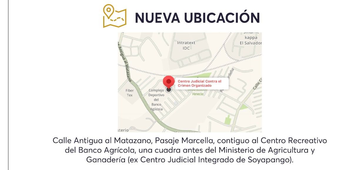 La Corte Suprema de Justicia (CSJ) informó que, a partir del lunes 14 de julio de 2025, el juez 4 del Tribunal Tercero Contra el Crimen Organizado de San Salvador atiende en una nueva ubicación: el Centro Judicial Contra el Crimen Organizado con sede en Soyapango.