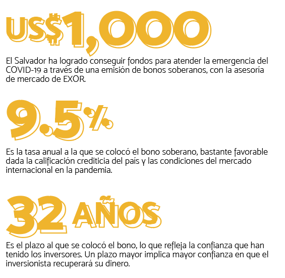 El Salvador realizó recientemente una emisión de bonos soberanos, que le permitió obtener US$1,000 millones para los fondos de emergencia que requiere para hacer frente a la pandemia del covid-19. El asesor de mercado en esta operación fue EXOR, sociedad global de servicios financieros que recientemente abrió su oficina regional para Centroamérica en El Salvador. Para esta operación, el equipo de trabajo de El Salvador incluyó a Banco Santander y a Scotiabank.
