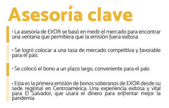 En la emisión del bono soberano de El Salvador, EXOR fungió como asesor de mercados. Su función principal fue, entonces, medir y evaluar el mercado diariamente y establecer las mejores fechas para la salida del bono, en medio de condiciones complicadas generadas en los mercados internacionales dentro del contexto de la pandemia.