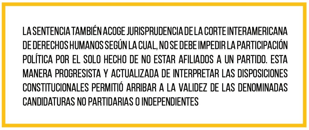 La sentencia también acoge jurisprudencia de la Corte Interamericana de Derechos Humanos según la cual, no se debe impedir la participación política por el solo hecho de no estar afiliados a un partido. Esta manera progresista y actualizada de interpretar las disposiciones constitucionales permitió arribar a la validez de las denominadas candidaturas no partidarias o independientes.