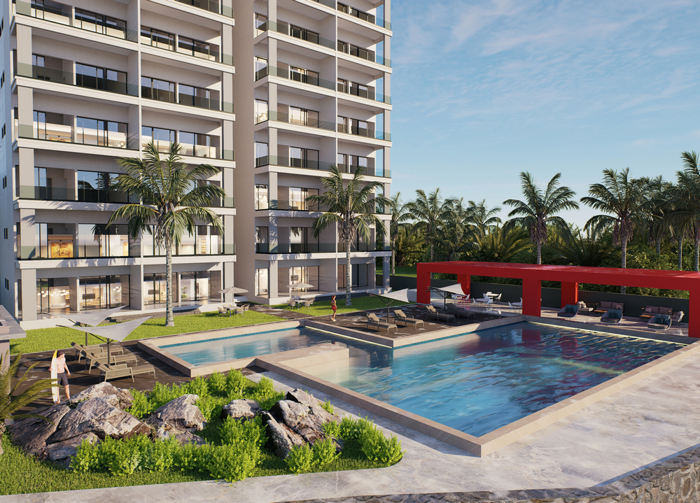 El complejo contempla una torre de 12 niveles con 60 apartamentos, áreas sociales, piscinas, jardines y acceso directo a la playa.