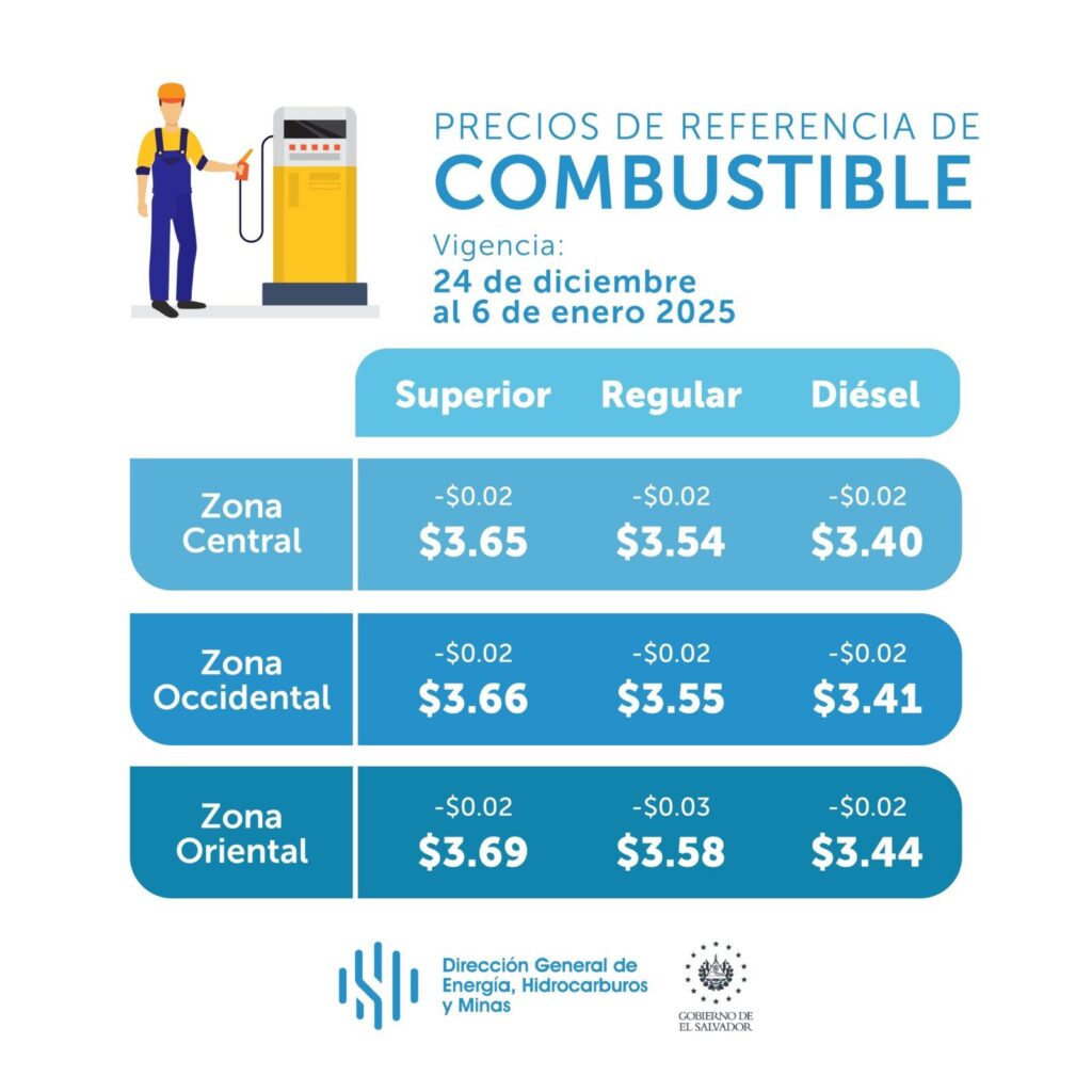 Además, el galón de gasolina regular tendrá una baja específica de $0.02 en el centro y occidente, con precios de referencia de $3.54 y $3.55, mientras que en oriente el descenso será de $0.03, fijándose en $3.58.
