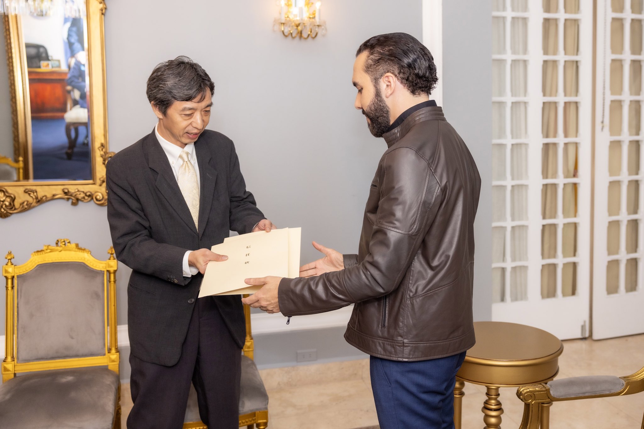 Los nuevos embajadores designados son Yoshitaka Hoshino de Japón, Sergio Luis Iaciuk de Argentina, Paolo Emanuele Rozo Sordini de Italia y Luis Briones de Nicaragua. Durante la ceremonia, Bukele sostuvo conversaciones con cada uno de los diplomáticos, acompañados de elementos del ejército que vestían los distintivos atuendos negros con capa utilizados en la toma de posesión presidencial.