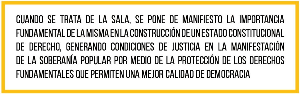 Así, la labor de la Sala no se limita a la de un tribunal ordinario, sin menospreciar la función que los mismos realizan como componentes esenciales del Órgano Judicial; sin embargo, cuando se trata de la Sala se pone de manifiesto la importancia fundamental de la misma en la construcción de un estado constitucional de derecho, generando condiciones de justicia en la manifestación de la soberanía popular por medio de la protección de los derechos fundamentales que permiten una mejor calidad de democracia y sistema político pluralista, con un gobierno republicano, democrático y representativo.