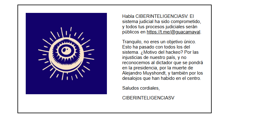 En correos electrónicos enviados a los abogados, “CIBERINTELIGENCIASV” informó sobre la exposición de sus procesos judiciales y justificó el hackeo como una represalia por las “injusticias del país”, mencionando la muerte de Alejandro Muyshondt y los desalojos en el centro de San Salvador.